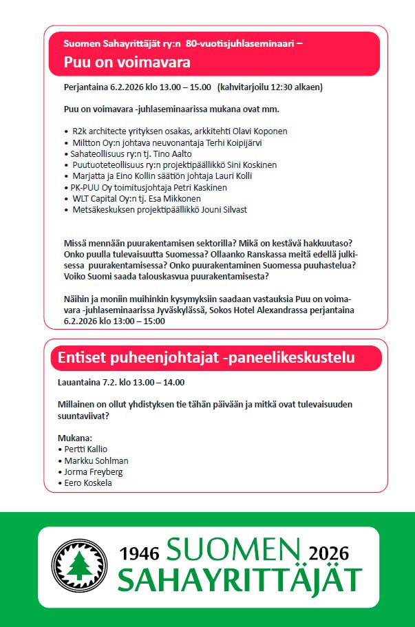 Suomen Sahayrittäjät ry juhlii 80 toimintavuottaan Sokos Hotell Alexandrassa helmikuussa. Ilmoittaudu mukaan nyt, sillä viimeinen ilmoittautumispäivä on 29.12.2025.